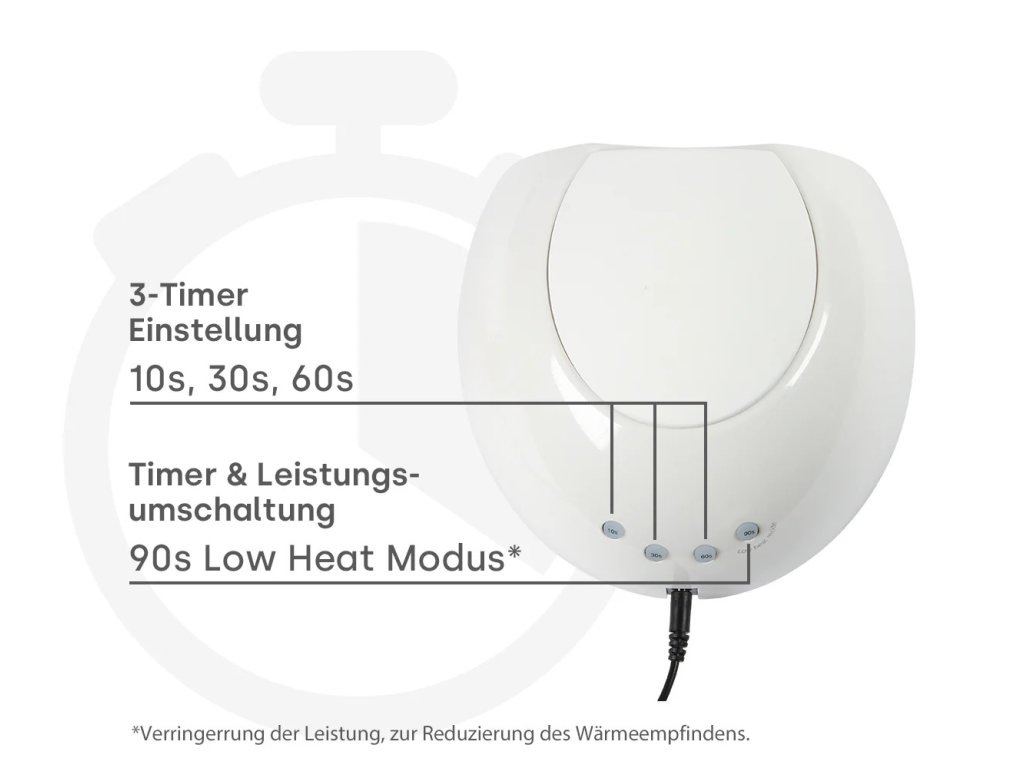 Aktivujte zariadenie pomocou svetelnej závory na 120 sekúnd alebo vyberte jeden zo štyroch časov (10, 30, 60, 90 sekúnd) pre dĺžku zapnutia zariadenia. Tak máte pre každú aplikáciu – od silne krycích farebných gélov po Sealing & Shine – vždy správny čas vytvrdnutia. Nastavenie 10 sekúnd je vhodné najmä na freezing modeláže pred pinchovaním. Vo plne zrkadlenom vnútri má ruka pohodlne miesto a všetky nechty, vrátane palca, sú perfektne osvetlené, aj pri stiletto nechtoch.