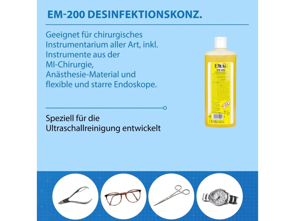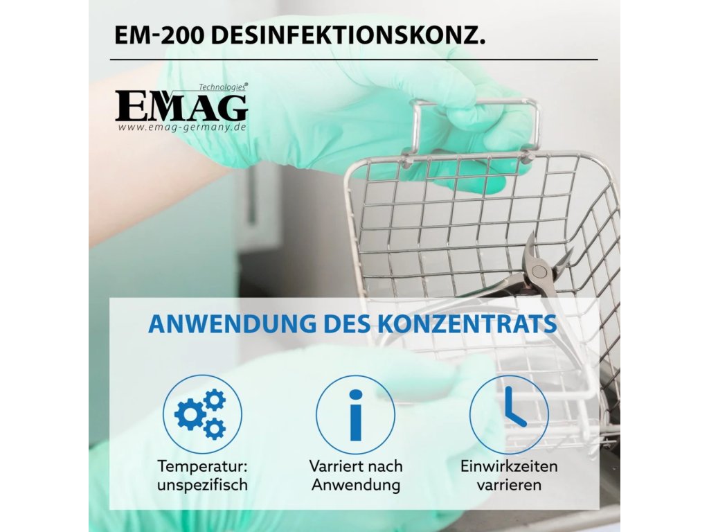 Vďaka kombinácii účinných látok je dezinfekčný koncentrát EM-200 schopný pokryť komplexné spektrum účinnosti s najnižšími možnými aplikačnými koncentráciami, bez nepríjemných zápachov pre personál. Je nevyhnutný v každej praxi a každom štúdiu. Na dezinfekciu a čistenie pevných predmetov, endoskopov a chirurgických nástrojov všetkého druhu. S mimoriadne účinnou ochranou proti korózii.