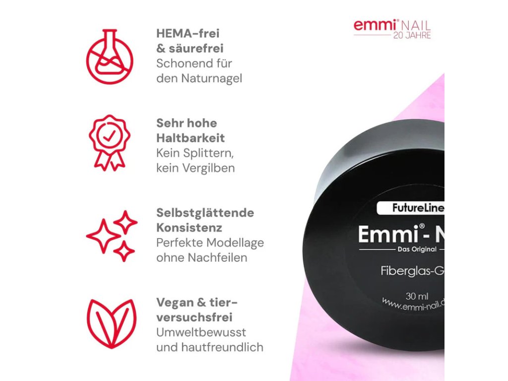 Nový Emmi-Nail Futureline Fiberglass Gel 30 ml je builder gél s vláknovými časticami pre mimoriadne stabilné modelovanie nechtov. Vysoká stabilita umožňuje obzvlášť tenké modelovanie nechtov, pritom zostáva flexibilný a nevytvára jemné prasklinky. Builder gél alebo modelovací gél sa používa ako druhá vrstva po podkladovom géli. Má strednú viskozitu, takže je ideálny na vytváranie C-oblúka. Gél je bez obsahu metakrylovej kyseliny, a preto je veľmi šetrný k prírodným nechtom. Je obzvlášť vhodný na predĺženie pomocou šablóny alebo spevnenie prírodných nechtov. Odporúčame kombinovať s ostatnými produktmi zo série Futureline pre dokonalý výsledok.