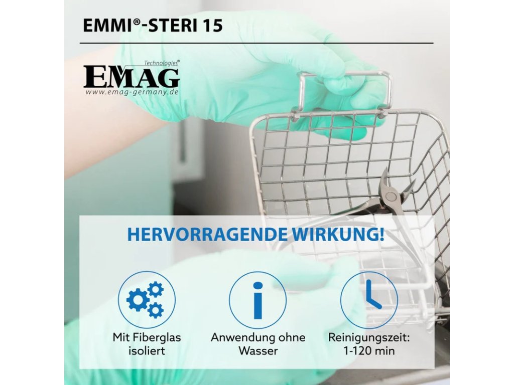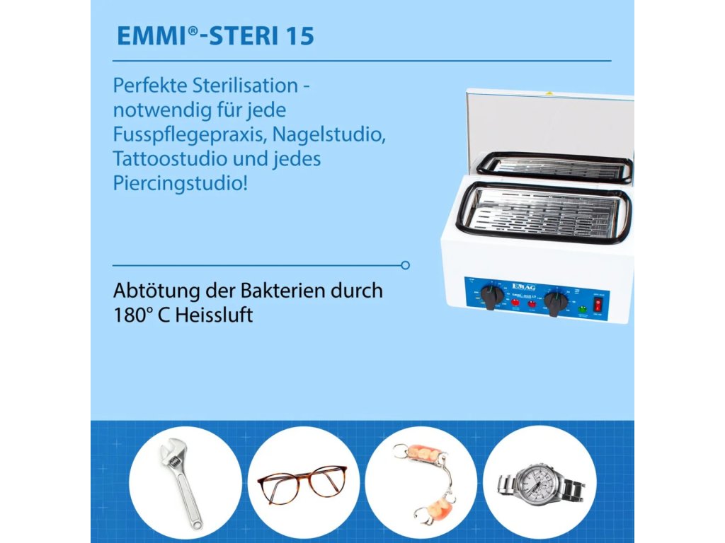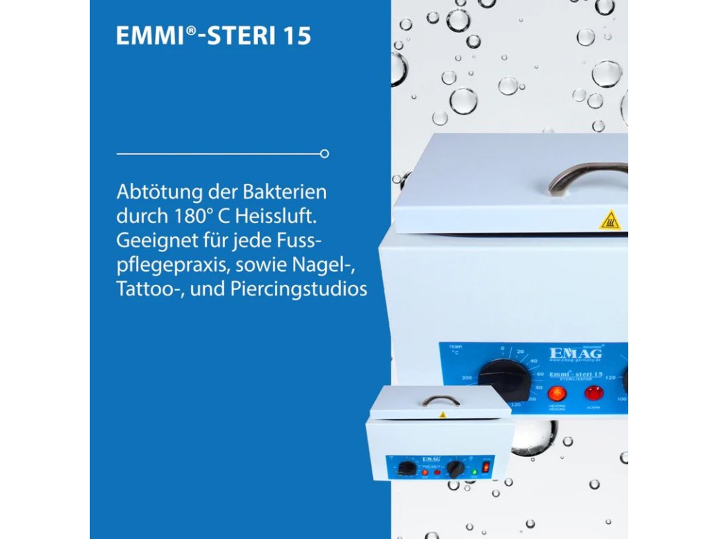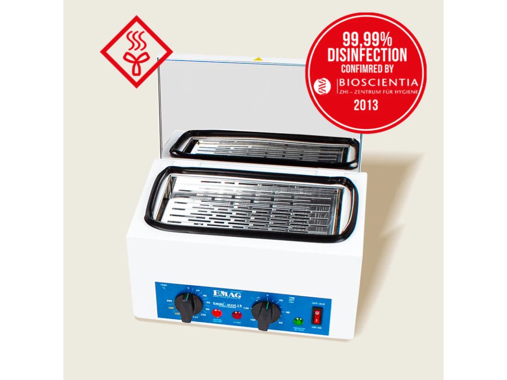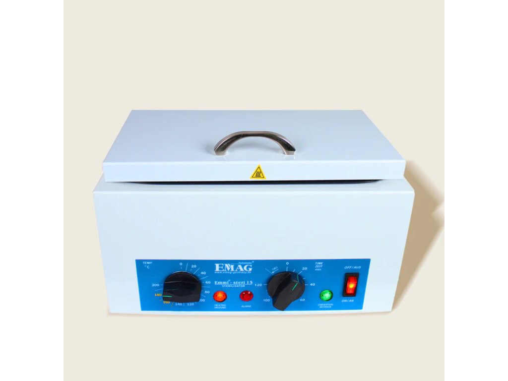 Horúci vzduchový sterilizátor Emmi-Steri 15 slúži na sterilizáciu všetkých pomôcok používaných pri nechtovej modelácii. Zariadenie sa vyznačuje vynikajúcou účinnosťou a jednoduchým ovládaním. Emmi-Steri 15 je kompletne izolovaný skleneným vláknom, aby na vonkajšej stene nevznikalo žiadne teplo. Doba čistenia je variabilná a nastaviteľná od 1 do 120 minút.
